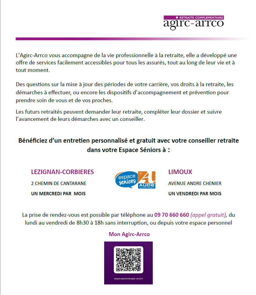 Pour bénéficier d’un entretien personnalisé et gratuit avec un conseiller retraite à l’Espace seniors à LEZIGNAN-CORBIERES, il est nécessaire de prendre rendez-vous par téléphone au 09 70 660 660 (appel gratuit) ou bien, depuis  l’espace personnel « Mon agirc-Arrco ». En effet, le conseiller retraite sera présent un mercredi par mois pour recevoir dans les locaux.