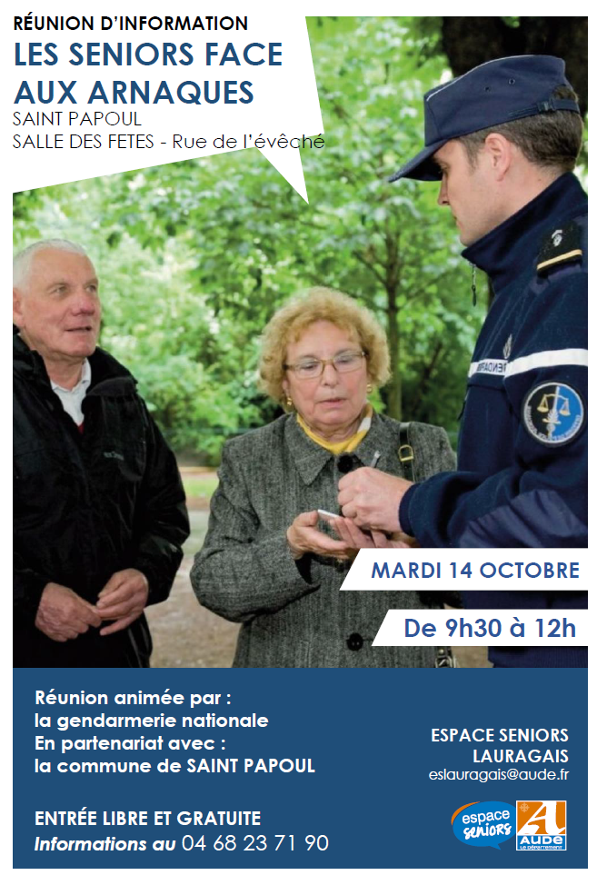 MARDI 14 octobre 2025 de 9h30 à 12h Rendez-vous à la SALLE DES FETES Rue de l’évêché à SAINT PAPOUL UNE RÉUNION D’INFORMATION ET DE SENSIBILISATION Réunion animée par la Gendarmerie nationale, en partenariat avec la commune de Peyriac de Mer et l’Espace séniors Départemental – Littoral. VENEZ VOUS INFORMER Dans le cadre de la […]
